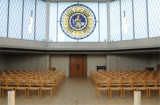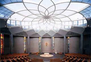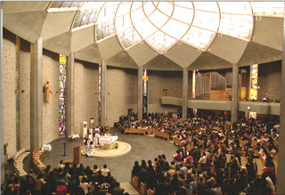 会衆席は食卓である祭壇を囲むように放射状に配置され、ミサに参加するすべての人々が一つの食卓に与れるように配慮されています。