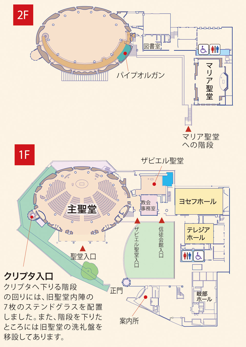 マリア聖堂正面の大きなステンドグラスは、教会のシンボルである聖イグナチオの御絵です。このステンドグラスは1949年に建築された旧聖堂正面を飾っていたもので、半世紀を共に歩み、これからも歩み続ける未来を象徴しています。